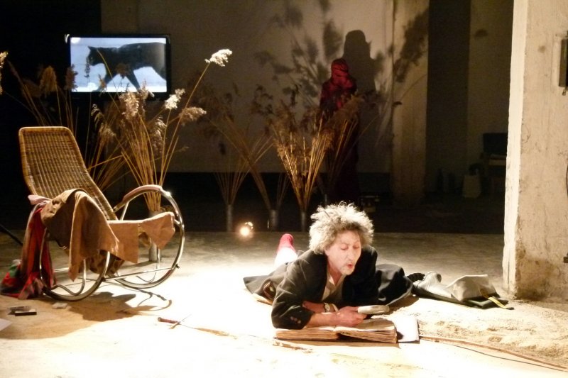 2. Scena iš S.Varno režisuotos premjeros S.Beketo pjesės „Paskutinė Krepo juosta“ motyvais „Dabar many visai kita ugnis“. Vaidina aktorius Sakalas Uždavinys. Nuotr. iš asmeninio albumo