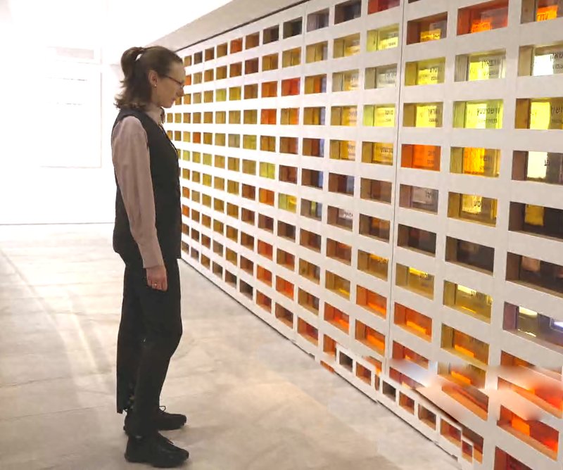 3. Edukacijos skyriaus vadovė J.Mickutė stovi prie sienos, kurioje surašyti visi – du šimtai – štetlo miestelių Lietuvoje.