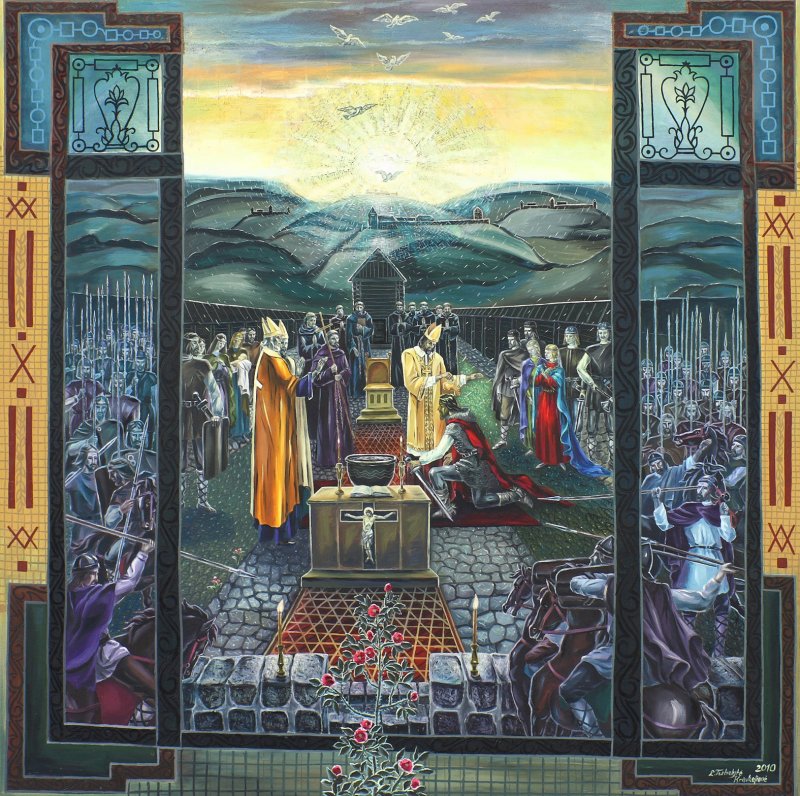 4. Saulė ir paukščiai paveiksle „Karaliaus Mindaugo krikštas“ simbolizuoja viltį ir gerovę.