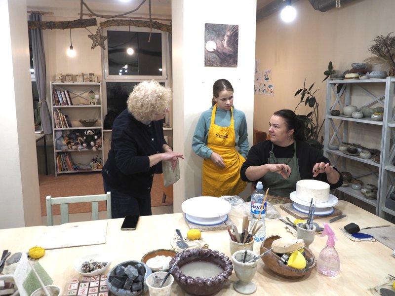 Šios pasirodo pirmos. Keramikė joms paaiškina apie molio savybes ir nurodo, kam kuris įrankis naudojamas.