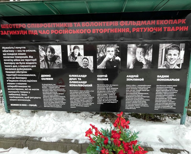 Šiaip kariai stengiasi gelbėti paliktus be priežiūros gyvūnus, dalijasi maistu, gabena į prieglaudas. Tuo tarpu okupantų žiaurumas, atrodo, neturi ribų. Įsiveržę į Charkivo pakraštyje esantį Feldmano ekoparką, okupantai į narvuose laikomus paukščius bei keturkojus šaudė savo malonumui. Ekoparkas buvo ne kartą bombarduojamas, nors jame, be prižiūrėtojų ir gyvūnų, nieko daugiau nebuvo. Per bombardavimus žuvo daugiau nei trys šimtai gyvūnų bei šeši darbuotojai. Žuvo ir penkiolikmetis vienos gyvūnų šėrėjos sūnus, atėjęs padėti išvežti gyvūnus į saugesnes vietas.