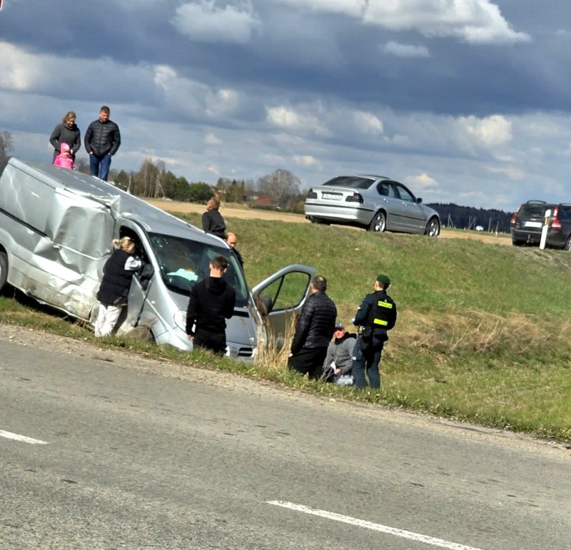 Stiprus smūgis mikroautobusą nubloškė į pievą, autobusas sustojo skersai kelio.