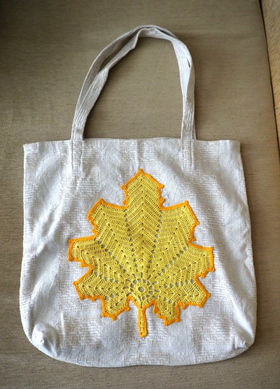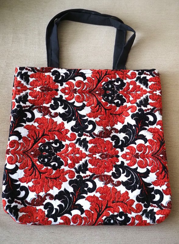 Moteris rodo ir kitokių maišelių, pavyzdžiui, su Heloviną primenančiais ornamentais, siūtų iš margo baldinio audinio atraižų ar medžiagos japoniškais motyvais.